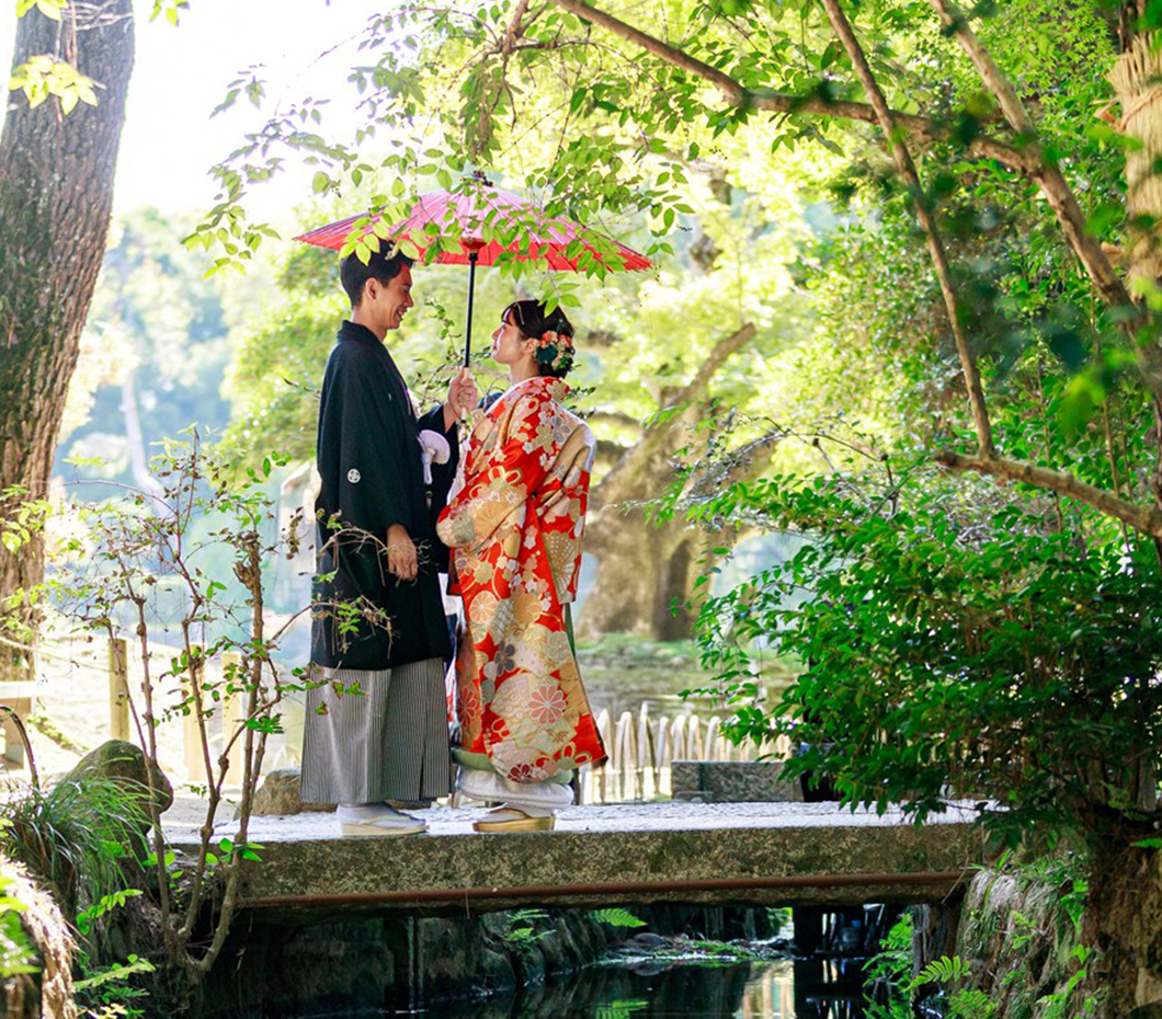 ビル最上階から岡山を代表する観光スポットがのぞめます。岡山城や後楽園での和装フォトウェディングや神前式後のパーティも承っています。